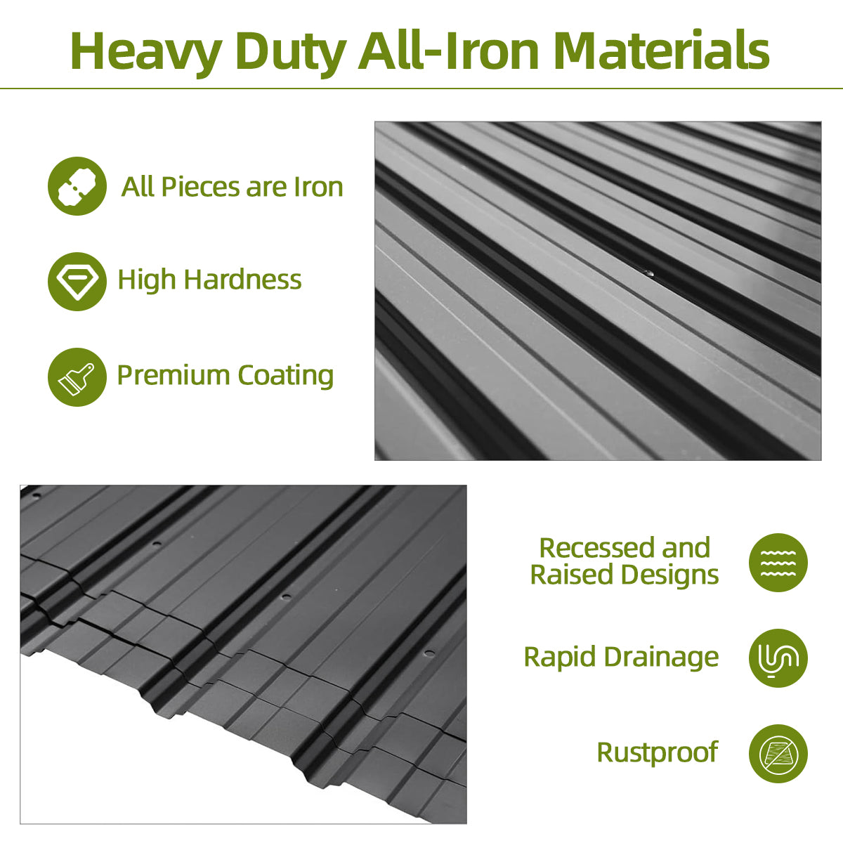 The double-top galvanized roof delivers excellent heat insulation and UV blocking (over 99%), while the vented design allows steady airflow and reduces wind pressure — keeping your space cool and comfortable.