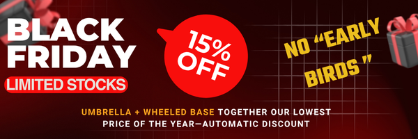 Note: Each umbrella comes with a metal cross base. For optimal stability and safety, we don’t recommend using the cross base on its own. Please purchase a compatible weighted base separately, or choose our Umbrella + Wheeled Base Bundle — this bundle includes a specially designed wheeled weighted base that securely supports your umbrella while allowing easy movement and repositioning.