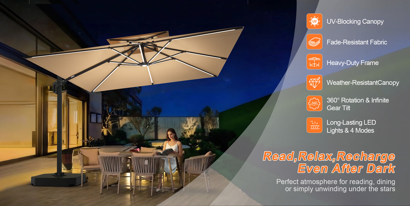 Enjoy stepless tilt adjustment and 360° rotation for all-day shade control, plus ambient evening lighting from 8 LED ribs and 7 light strips, totaling 12.5m, with four adjustable brightness levels.