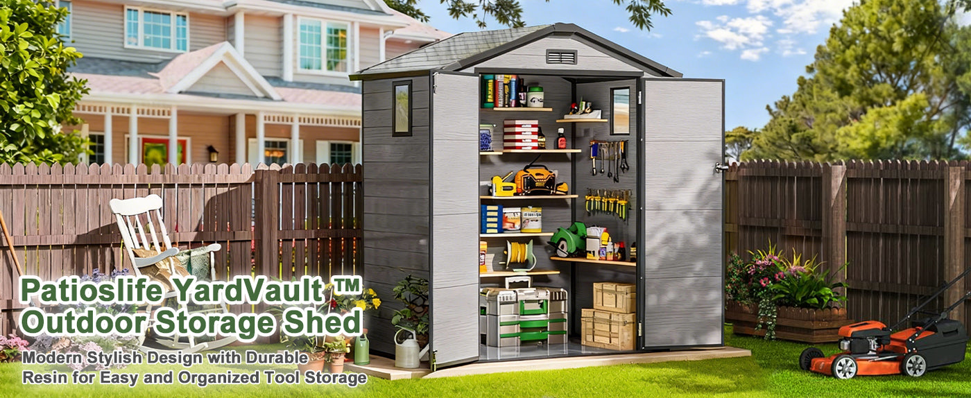 Meet the Patioslife YardVault Resin Outdoor Storage Shed with Floor—a tough, low-maintenance storage solution built for year-round backyard use. Its 20 mm double-layer resin construction and extra-strong 4-layer HD panels deliver reliable strength and stability, while UV-resistant, waterproof, rustproof polypropylene helps protect your tools, bikes, and lawn equipment through changing seasons. The included heavy-duty floor means it’s ready to use right after assembly, and built-in ventilation plus translucent windows keep the interior brighter and better aired, helping reduce dampness. Finished with reinforced double doors and a lock-ready hasp, YardVault keeps your gear secure—without the hassle of painting or sealing.
