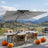 The louvered roof is designed to provide shade when open and full rain protection when closed. An integrated drainage system channels rainwater through the posts to prevent pooling on the roof.
