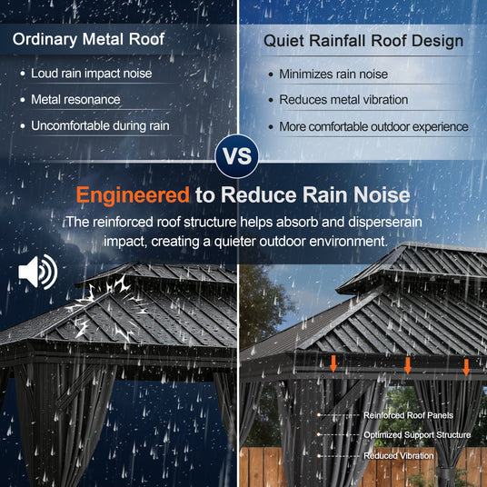 The reinforced metal roof is engineered to minimize rain noise.Its sturdy structure and optimized panel support help reduce vibration, creating a quieter and more comfortable outdoor experience during rainfall.