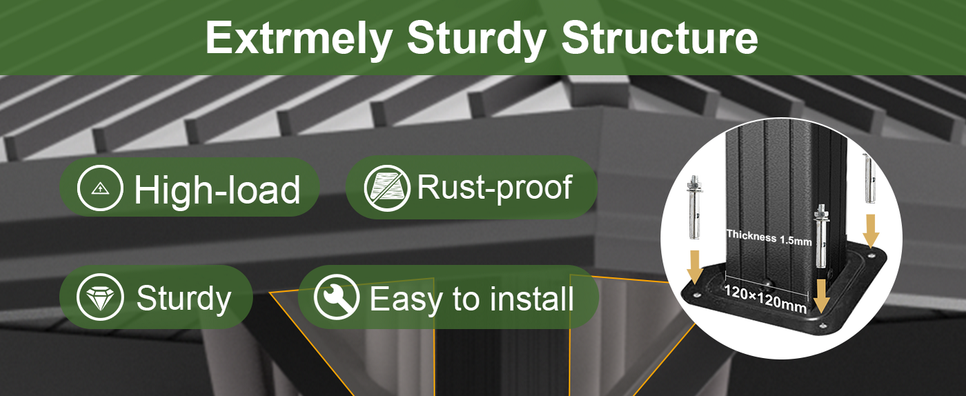 Our gazebo features a pre-drilled anchoring frame for secure setup on concrete or decking. The intuitive design with labeled parts makes assembly simple. With 120×120mm posts and 1.5mm thick steel, it stays stable in strong winds and supports up to 500kg on the roof for lasting durability.