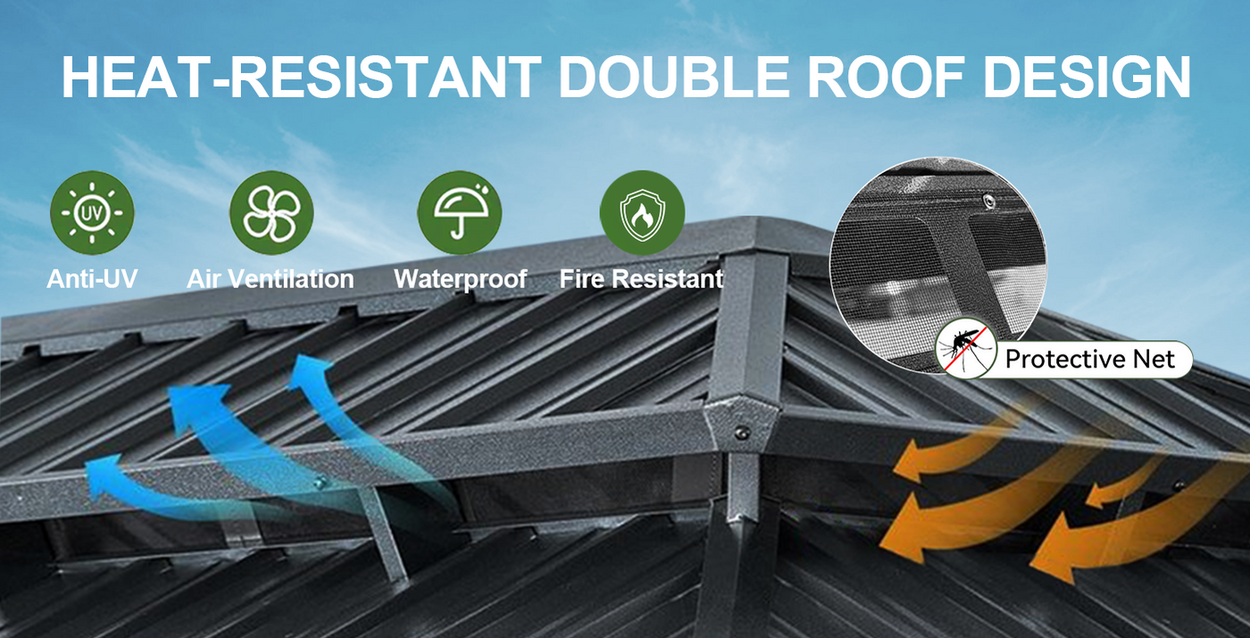 Special heat-reflective coating reflects sunlight and helps block heat.Keeping the space cooler even on hot days. Better Airflow – Double-vented roof with protective net lets hot air out and cool breezes in and keep mozzies and insects out, so you stay comfortable all day.