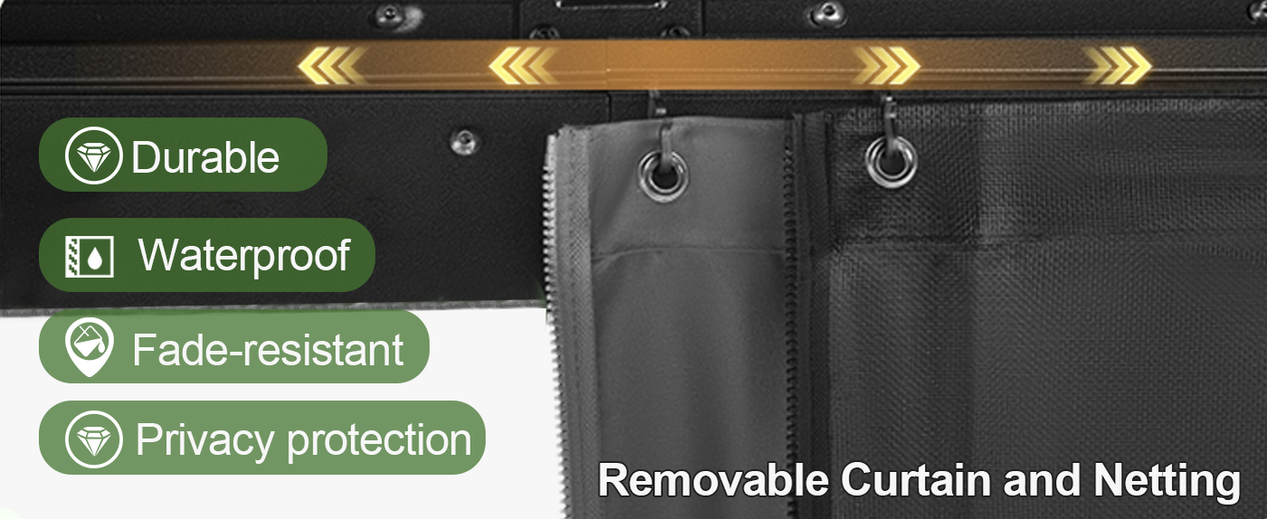 Privacy & Comfort – Comes with removable polyester curtains and fine mesh netting featuring smooth double-track zippers, giving you flexible options for shade, ventilation, and insect protection.