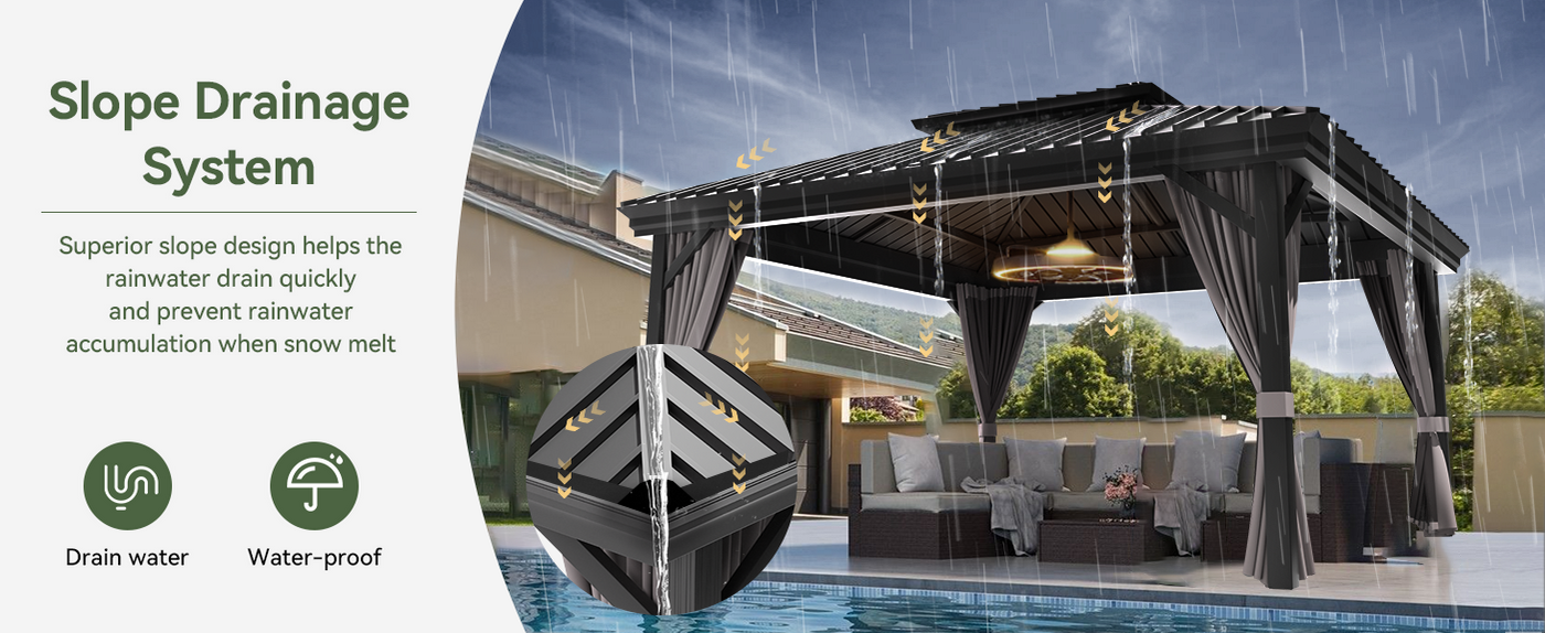 The advanced drainage system is designed to channel rainwater from the edge of the aluminium gazebo roof into the posts and down to the ground, helping to prevent water build-up and reducing hassles during rainy and snowy seasons.