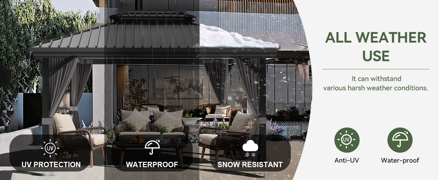 Our gazebo is built for year-round enjoyment — from summer sun to heavy rain and winter snow. The galvanized steel roof provides 99% UV protection and fade resistance, while the reinforced aluminum frame ensures stability. Withstands 40 mph (65 km/h) winds in standard setup, and up to 60+ mph (97+ km/h) with permanent concrete fixing.