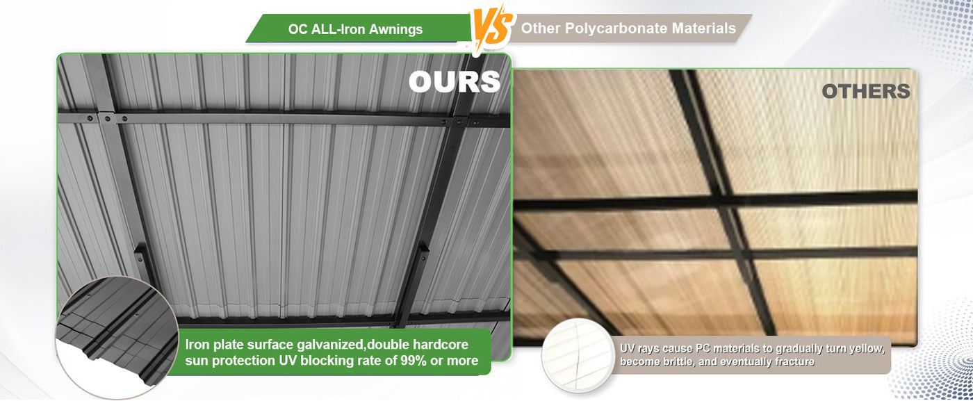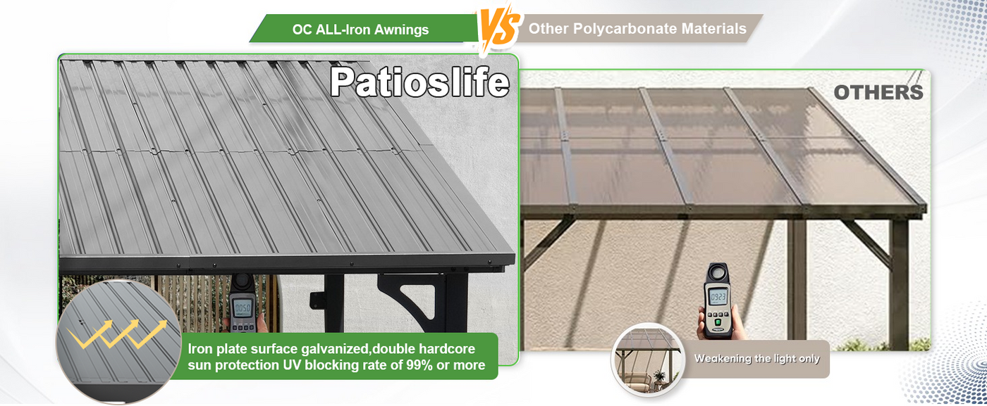 While ordinary PC awnings gradually yellow, crack, and weaken under prolonged UV exposure, the Patioslife advanced plated surface system features galvanized dual-layer protection with a UV-blocking rate exceeding 99%.