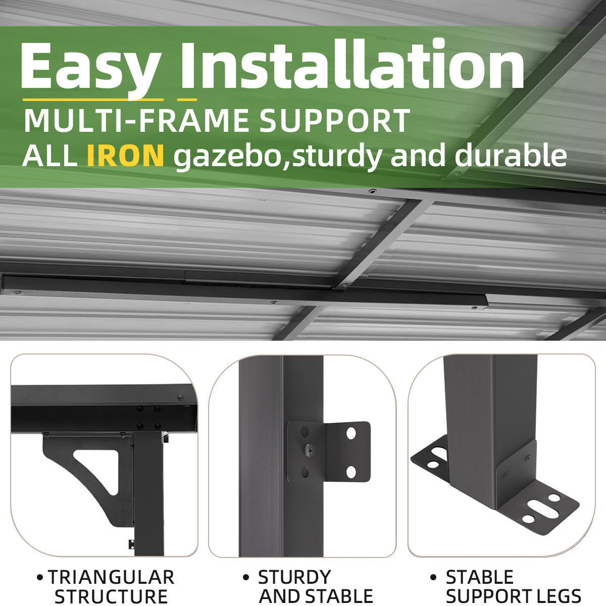 Built with triangular reinforcement, ground anchors, and reinforced roof brackets, this all-iron gazebo stays secure even in strong winds.
